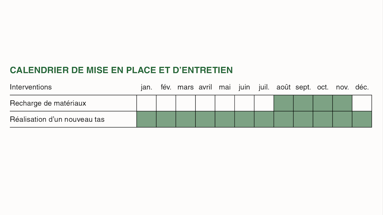 Eviter les interventions en période hivernale (perturbation des animaux hibernants dans le tas).