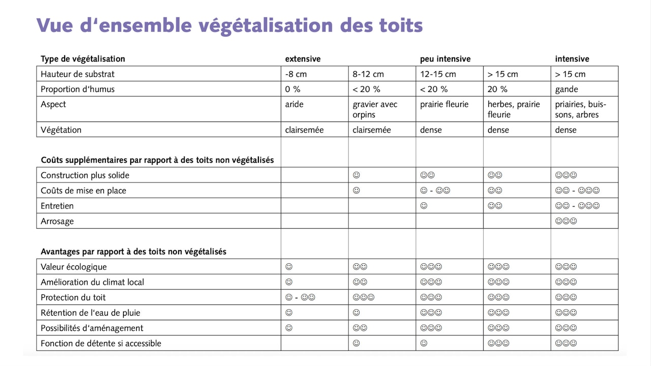 Les coûts pour une végétalisation extensive sont de l’ordre de Fr. 35.- à Fr. 80.-/m2 .